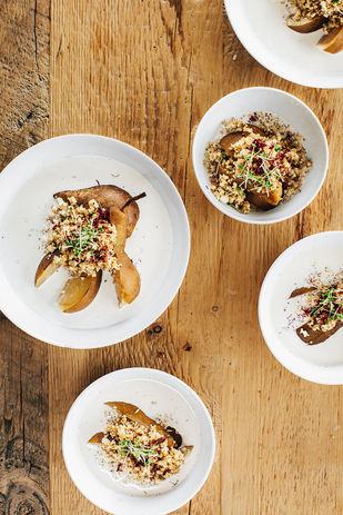 LES FRUITS SOUFFLÉS - Exemple de recette associée : Poire vapeur, lait d’amande à la cannelle, granola au quinoa vapeur, zeste de citron, gingembre et sucre de coco